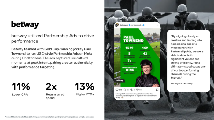 Betway’s Cheltenham campaign set the benchmark. UGC-style Partnership Ads featuring Gold Cup-winning jockey Paul Townend delivered 2x ROAS, 11% lower CPA and 13% more first-time deposits versus non-partnership creative (source: Meta internal data, March 2026). With 240 million sports bettors set to follow the FIFA World Cup on Meta platforms, operators building a video-first, creator-led production cycle now will be best positioned to capture that moment.