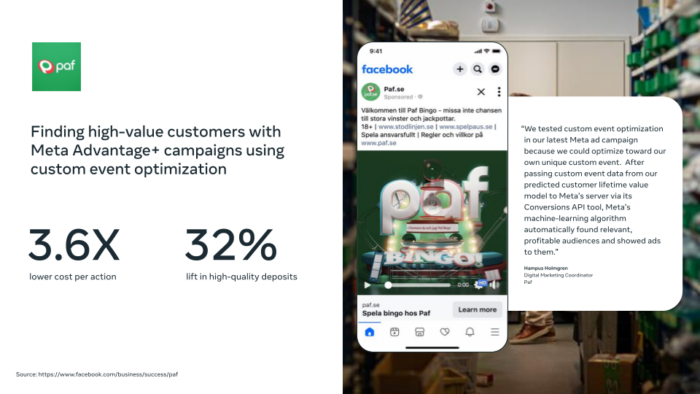 Paf demonstrated this perfectly. The Nordic operator piped its own predictive lifetime-value model directly into Meta via the Conversions API, telling the system exactly what a high-value customer looked like. The result: a 3.6x lift in high-quality deposits (source: Meta for Business, PAF case study). The takeaway is clear – if an operator’s Event Match Quality score sits below 8.0, efficiency is being left on the table.