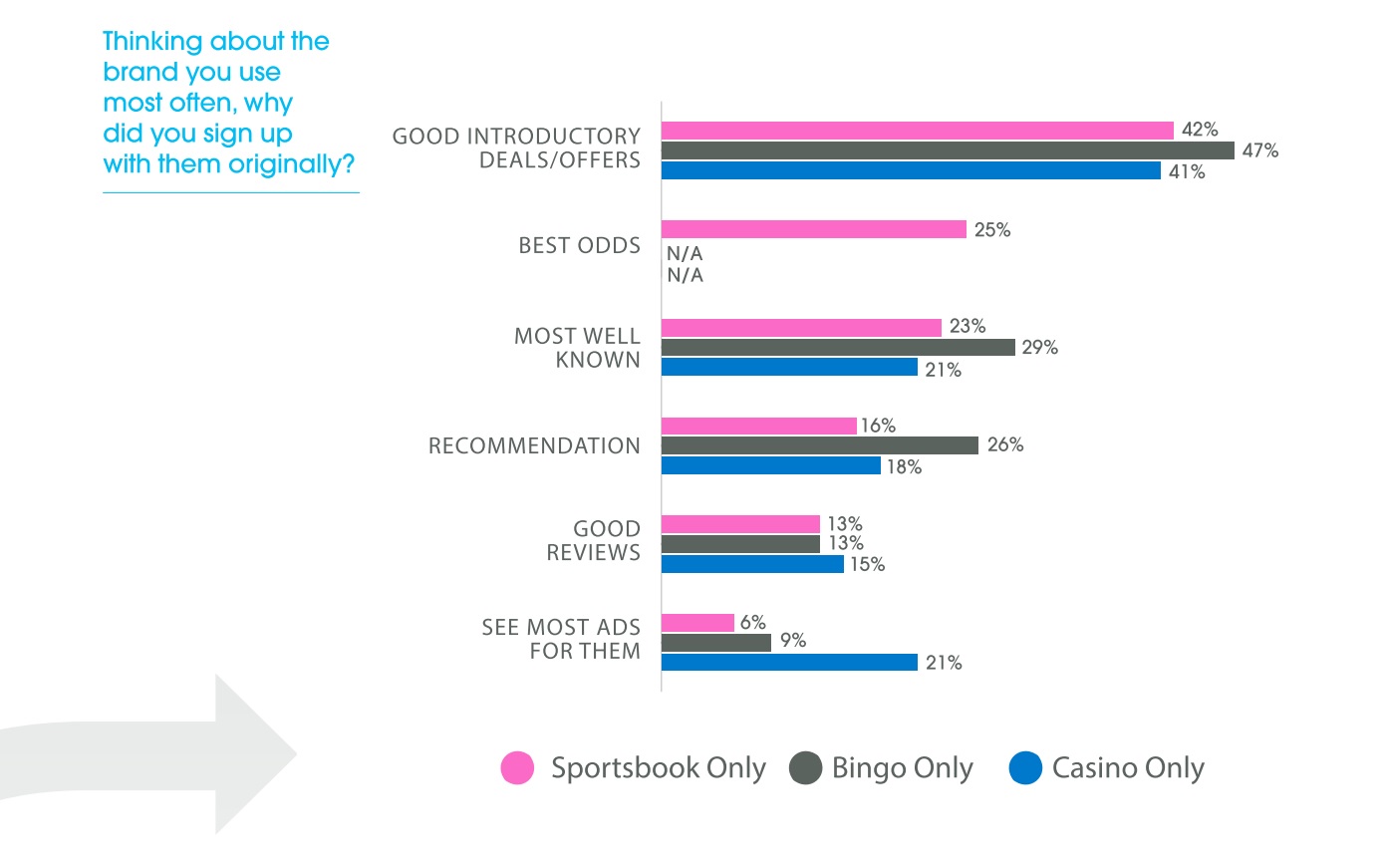 The report also found that 38% of all gamers had switched at least once from the brand they most used to another – 35% for sportsbook-only, 49% for casino-only and 27% for bingo-only.