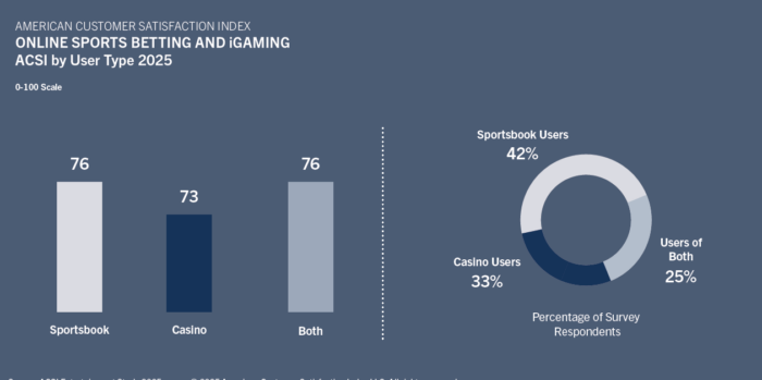 Of the two, sportsbook users boast a higher level of customer satisfaction with a score of 76, three points more than that of online casino players.